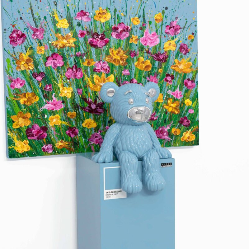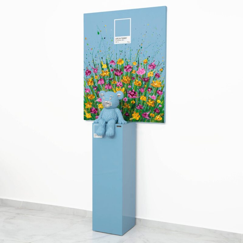 | Medium | Heavy body acrylic on canvas, resin sculpture with silver-plated detailing, mounted on a wooden pedestal, with automotive paint and a high-gloss finish |