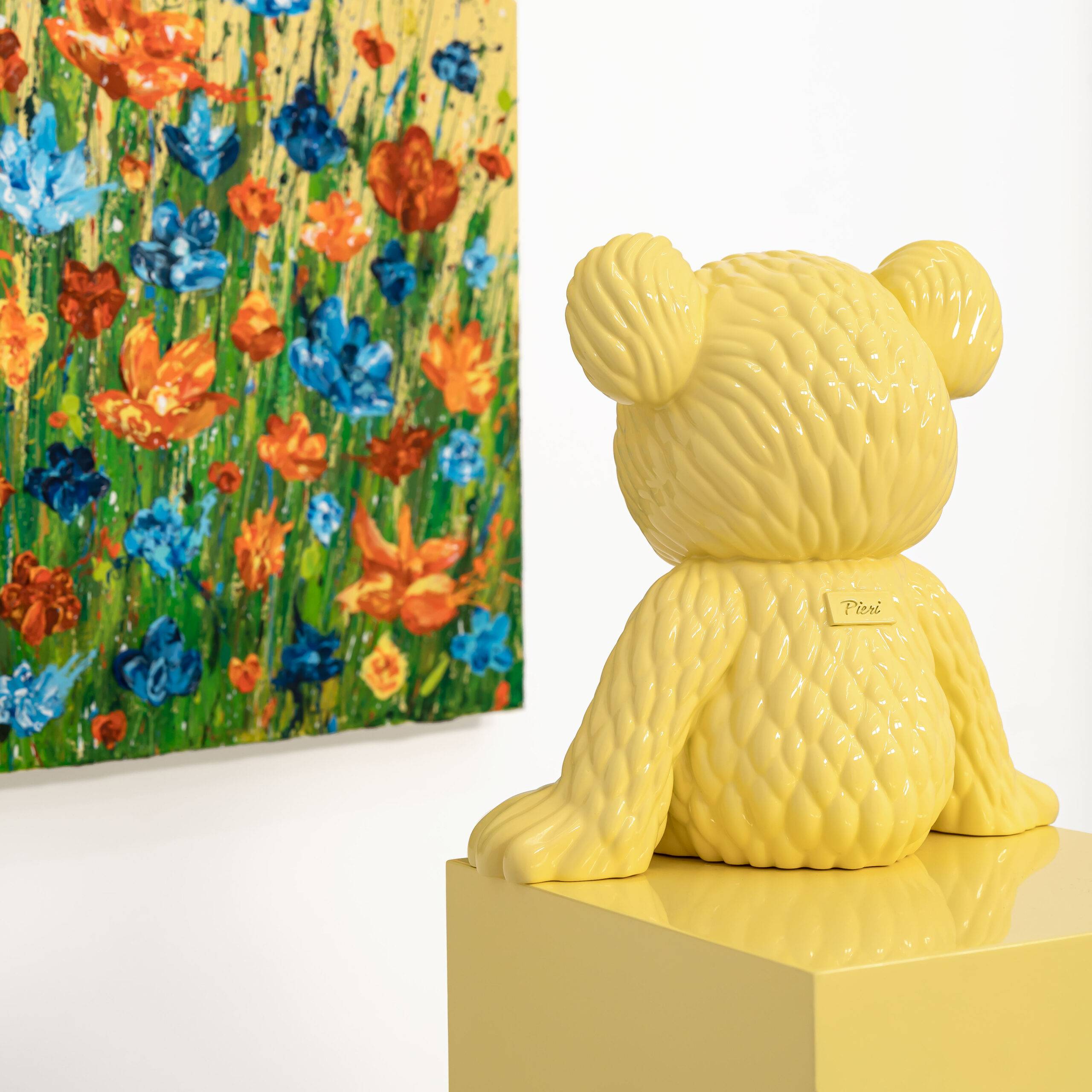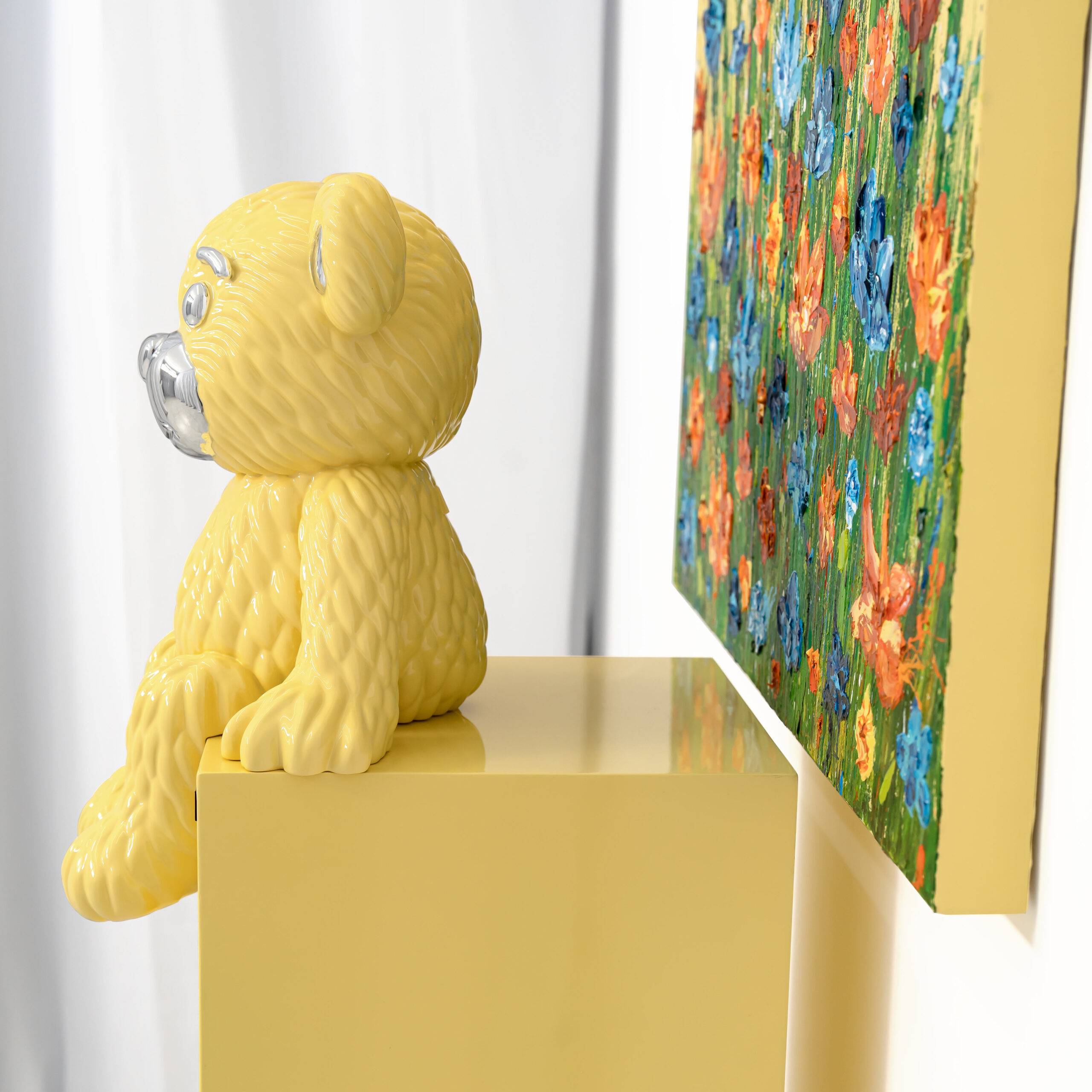 | Medium | Heavy body acrylic on canvas, resin sculpture with silver-plated detailing, mounted on a wooden pedestal, with automotive paint and a high-gloss finish. |